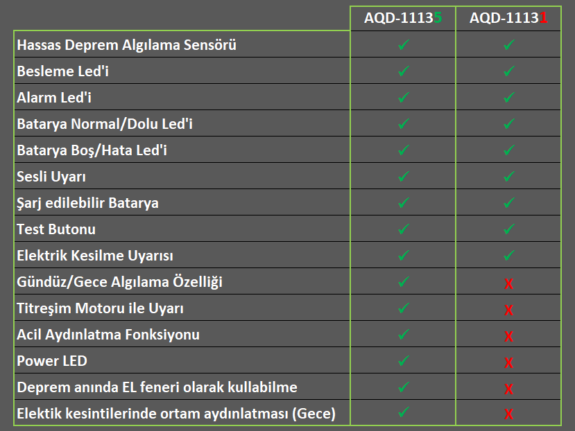 |AQD-11135 Deprem uyarı cihazı içerisinde gelişmiş titreşim algılama sensörü ve bir yazılım algoritması vardır. Böylece en düşük genlikli titreşimleri bile sorunsuzca algılar, analiz eder ve Alarm verir.